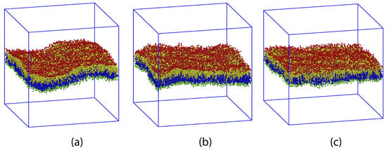 To set up the simulation, a planar bilayer is preassembled by placing lipid molecules onto two adjacent planes, thereby forming the initial states of the lower and upper leaflet of the bilayer. Once such an initial bilayer has been assembled with lipids in the lower and lipids in the upper leaflet, it spans the simulation box as in Figure 5. For the one-component bilayers discussed in this section, the lipids do not undergo flip-flops between the two leaflets which implies that the lipid numbers and do not change during the simulations.