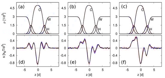 Density and stress profiles across lipid bilayers as functions of the coordinate z perpendicular to the bilayers. All bilayers are tensionless, i.e., the bilayer tension as given by the integral over z, see Equation (2), is close to zero. The bilayers contain lipids in their lower leaflet and lipids in their upper leaflet: (a–c) Density profiles of the water (W), headgroup (H), and hydrophobic chain (C) beads; and (d–f) Stress profiles across the same bilayers as in the upper row. The bilayer in (a,d) is symmetric with lipids in each leaflet. The bilayer in (b,e) is asymmetric with and . The bilayer in (c,f) has a larger transbilayer asymmetry with and . The blue, red, and black lines correspond to different heights of the simulation box, as given by , , and . Comparison of these three lines implies that finite-size effects arising from the box height can be ignored [24].
