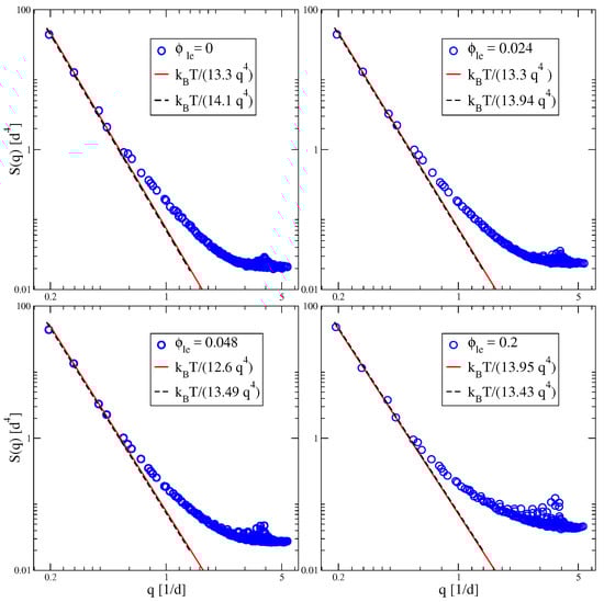 Therefore, in order to characterize a lipid bilayer by its curvature, one has to consider small membrane patches and to average over the molecular conformations within these patches. The minimal lateral size of these patches can be determined from the spectrum of the bilayer’s shape fluctuations and was found to be about 1.5 times the membrane thickness, see Figure 4, for both one-component [24,36] and two-component [25] lipid bilayers, see Section 4.1.4 and Figure 11 below. For a membrane with a thickness of 4 nm, this minimal size is about 6 nm. Because such a membrane patch contains 80–100 lipid molecules, membrane curvature should be regarded as an emergent property arising from the cooperative behavior of many lipid molecules on supramolecular scales.