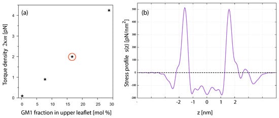 In practice, one can reduce the integration over z to a smaller interval because the stress profile decays rapidly to zero as we move away from the bilayer, see the examples in Figure 7d–f.