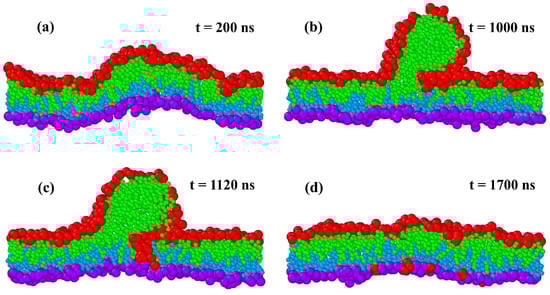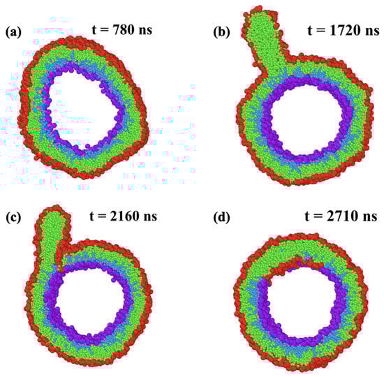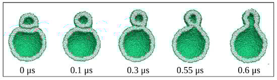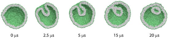 Electron microscopy methods also represent the main experimental approach to study the morphology of nanovesicles [19,20,21,22,23]. One disadvantage of these methods is, however, that they provide only a single snapshot of each vesicle. In contrast, computer simulations with molecular resolution can reveal the molecular dynamics of the lipids and the nanoscale dynamics of the bilayers, thereby monitoring and elucidating the spatio-temporal remodeling of individual nanovesicles.
