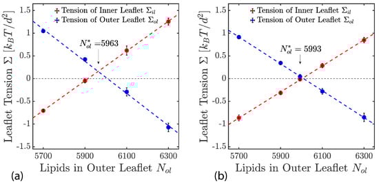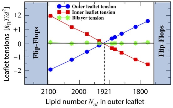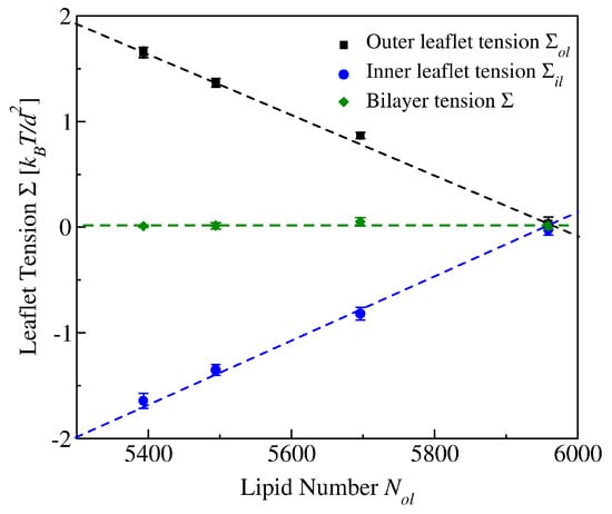 For planar bilayers, the leaflet tensions depend on the lipid numbers and assembled in the lower and upper leaflet of the bilayer as well as on the base area of the simulation box, see Figure 5. This figure displays three symmetric bilayers, which contain the same number of lipids, , in each leaflet but differ in the base area of the simulation box. The symmetric bilayer in Figure 5b corresponds to the reference state of the bilayer with tensionless leaflets and leaflet tensions . For this reference state, the area per lipid, a, has the optimal value and the volume per lipid, v, has the optimal value [32]. The symmetric bilayer in Figure 5a has a reduced base area compared to the reference state in Figure 5b whereas the symmetric bilayer in Figure 5c has an increased base area.