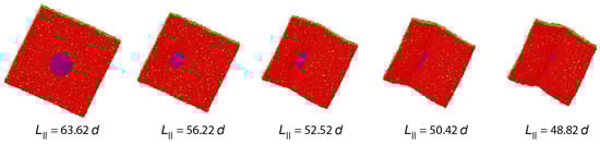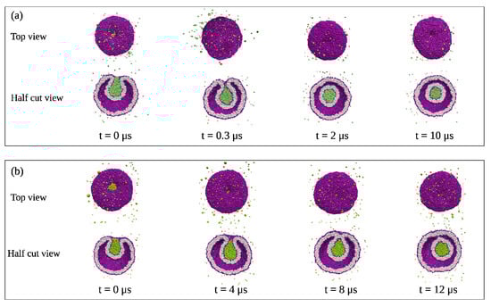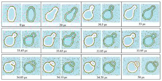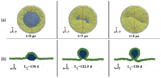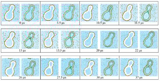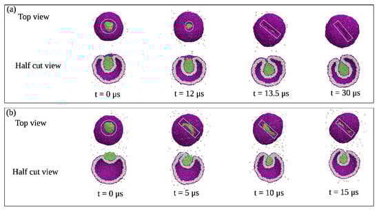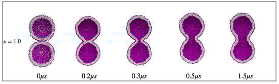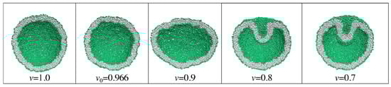 The two spherical vesicles in Figure 6a,c have the same size and, thus, the same curvature of the bilayer membrane. Comparing the behavior of nanovesicles with different sizes shows that the fluid-elastic behavior of the nanovesicles depends on this curvature as well [30,32].