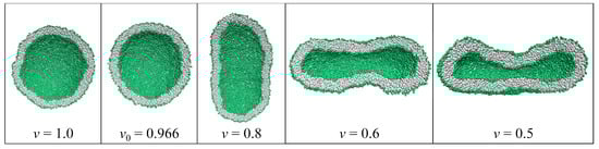 which is negative and positive for fission and fusion processes, respectively, [47]. For the shape transformations in Figure 6, both the initial and the final vesicle state have the same topology and, thus, the same Euler characteristic, . As a consequence, the change of the Gaussian curvature energy vanishes and plays no role for the shape transformations in Figure 6. The latter feature applies to all shape transformations, which proceed via smoothly curved membranes and leave the local bilayer structure intact.