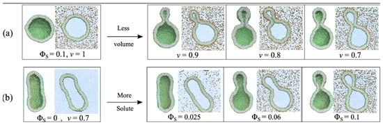 This figure displays two spherical nanovesicles, one of which transforms into a stomatocyte with an in-bud, the other into a dumbbell with an out-bud. The spherical nanovesicle in Figure 6a is bounded by an inner leaflet that contains lipids and by an outer leaflet with lipids. A slight reduction of the vesicle volume, which mimicks the experimental procedure of osmotic deflation, leads to a tensionless bilayer, for which the inner leaflet is compressed whereas the outer leaflet is stretched. The spherical nanovesicle in Figure 6c is bounded by an inner leaflet that contains lipids and by an outer leaflet with lipids. A slight reduction of the vesicle volume now leads to a tensionless bilayer, for which the inner leaflet is stretched whereas the outer leaflet is compressed [28].