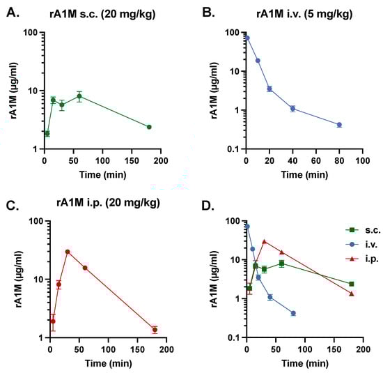 Pharmacokinetic study of rA1M. Plasma concentration of rA1M in female BALB/cJBomTac mice (n = 3–4/timepoint) after s.c. (20 mg/kg, (A)), i.v. (5 mg/kg, (B)), or i.p. (20 mg/kg, (C)) administration. In (D) all three administration routes are presented. Data is presented as mean ± SEM.
