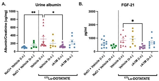 Evaluation of the protective effects of i.v. vs. s.c. administered rA1M. Albumin levels in urine (A) and plasma FGF-21 (B) were measured 4 days after dosing in animals receiving NaCl and the vehicle (i.v. or s.c., volume corresponding to that of 150 MBq 177Lu-DOTATATE or rA1M injections, respectively), 150 MBq 177Lu-DOTATATE with vehicle (i.v. or s.c., volume corresponding to that of rA1M injections), or with rA1M (i.v., 5 mg/kg or s.c., 20 mg/mg). Data is presented as scatter plots with mean ± SEM. Statistical comparison between groups was made with one-way ANOVA with a Šídák’s multiple comparisons post-hoc test. Comparison was made between groups with the same administration route and between rA1M i.v. and s.c. Only significant differences are presented in the figure. * p < 0.05, ** p < 0.01.