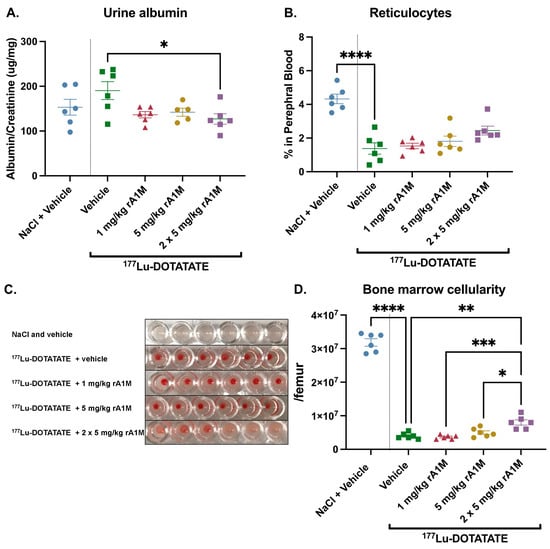 As described above, hematotoxicity, in addition to renal toxicity, constitutes one of the main limiting factors during 177Lu-DOTATATE therapy. In the current study, we evaluated the hematotoxic effects of 177Lu-DOTATATE (150 MBq) with or without rA1M (1, 5 or 2 × 5 mg/kg), focusing on bone marrow cellularity and reticulocyte percentage in peripheral blood. It was observed that the percentage of viable reticulocytes was significantly reduced in peripheral blood following exposure to 177Lu-DOTATATE. Administration of rA1M, prior to the 177Lu-DOTATATE administration, had an increasing trend of preserving reticulocyte population with increases in dose compared to the vehicle (Figure 3B), although this was not statistically significant. The cellular content of the bone marrow decreased drastically when mice were administered with 177Lu-DOTATATE. However, mice receiving rA1M showed a clear trend of preserving the white marrow, as observed by visualizing the total bone marrow cell pellet. The images show a clear preservation of the white marrow after two doses of rA1M (5 mg/kg/dose) compared to the vehicle group, as well as to the one rA1M dose (1 or 5 mg/kg) treated groups (Figure 3C, uncropped plate in Supplementary Figure S1). This was further confirmed by the total bone marrow cell count, displaying a significant protective effect of 2 × 5 mg/kg rA1M (Figure 3D), preserving twice the number of cells as 177Lu-DOTATATE alone.