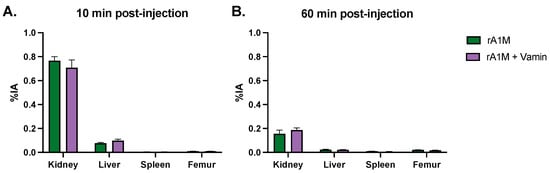 In the third part of this study, we investigated the possibility of combining infusion of amino acids with rA1M as a kidney protective measure. At first, the biodistribution of rA1M was investigated 10 and 60 min post-injection of rA1M alone or in combination with amino acids (Vamin, 35 mg/200 µL, administered i.p.). There was no significant difference in rA1M distribution to the organs investigated, i.e., kidney, liver, spleen, and femur, when combining with Vamin (Figure 4A,B and Supplementary Table S1).