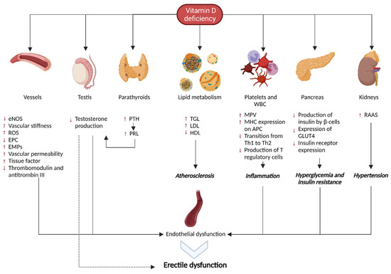 Many possible mechanisms linking VDD and ED have been proposed. In detail, the effect of VDD on endothelial function, the role of VD in the upregulation of NO synthase (NOS), the increase in the degree of inflammation, and the possible endocrinological dysregulation due to VDD are among the main mechanisms involved [15].