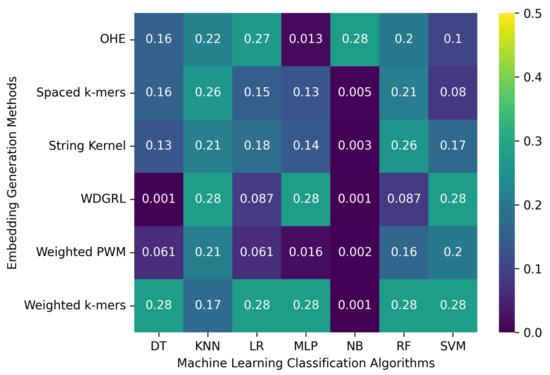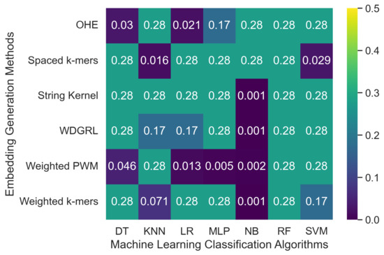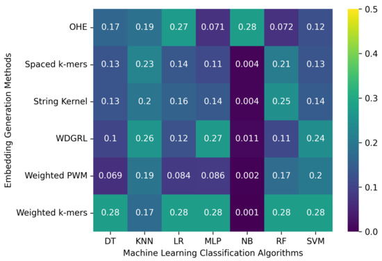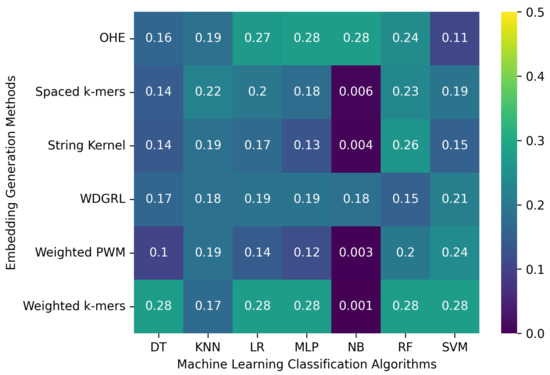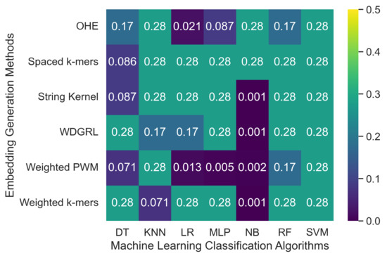 Table 4 displays the accuracy values obtained from different machine learning algorithms using various embedding methods on two SARS-CoV-2 genome sequence datasets with depths of 5 and 10, respectively, which were generated from long-reads containing Oxford Nanopore Technology (ONT) sequencer-specific errors. Moreover, Figure 4 presents a heatmap that visualizes the accuracy values, which ranged from 0.001 to 0.276. The weighted k-mers embedding method resulted in the highest accuracy values for the majority of the machine learning algorithms on both datasets, i.e., depths of 5 and 10. Because each k-mer is given a weight depending on its inverse document frequency under the weighted k-mers technique, this method generates fixed-length vectors that capture the existence of all potential k-mers. These vectors are then used to create frequency vectors that indicate the frequency of each k-mer in the sequence. However, due to the lower sequencing depth with ONT sequencer-specific errors, poor-quality SARS-CoV-2 genome sequences were generated, leading to a significant decrease in the predictive performance of machine learning algorithms.