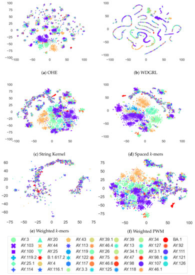 The t-distributed stochastic neighbor embedding (t-SNE) method is a widely used data visualization technique that preserves the pairwise distances between high-dimensional vectors in a lower-dimensional space. In this study, we employed t-SNE to visualize the clustering patterns of different coronavirus variants using various embedding vector generation methods, including one-hot encoding (OHE), Wasserstein-distance-guided representation learning (WDGRL), string kernel, spaced k-mer, weighted k-mer, and weighted position weight matrix (PWM). Our analysis, as depicted in Figure 6, reveals the remarkable effectiveness of t-SNE in capturing the pairwise distance information and unveiling the distinct grouping patterns of coronavirus variants in a two-dimensional space. Specifically, the t-SNE plot based on the OHE vector demonstrated that AY.44 variants were more clearly grouped than the other variants, while the WDGRL vector maintained a smaller group of variants than OHE vector. Furthermore, the string-kernel-vector-based t-SNE plot exhibited clearer grouping patterns of AY.44 and other variants than the OHE vector. Additionally, the spaced k-mer vector method showed a more distinct grouping of variants compared to other embedding vector generation methods. The weighted k-mer vector exhibited grouping of the variants similar to the WDGRL vector, whereas the weighted PWM vector showed grouping patterns more similar to the string kernel vector.