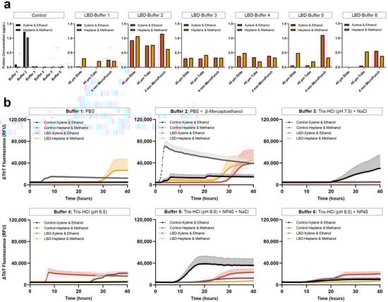 Comparison of FFPE protein extraction efficiency and subsequent αSyn seeding using various tissue preparations, deparaffinization, and extraction methods. (a) Protein yield obtained with either xylene-ethanol or heptane-methanol deparaffinization, extracted from 4-mm micro-punch of the parietal cortex of test control subject and 45-µm FFPE sections on slides, in tubes, or 4-mm FFPE micro-punch of the temporal cortex of test LBD subject, using six different extraction buffers; (b) Subsequent αSyn seeding potential of the extracted proteins from 4-mm FFPE micro-punch of LBD temporal cortex and control parietal cortex.