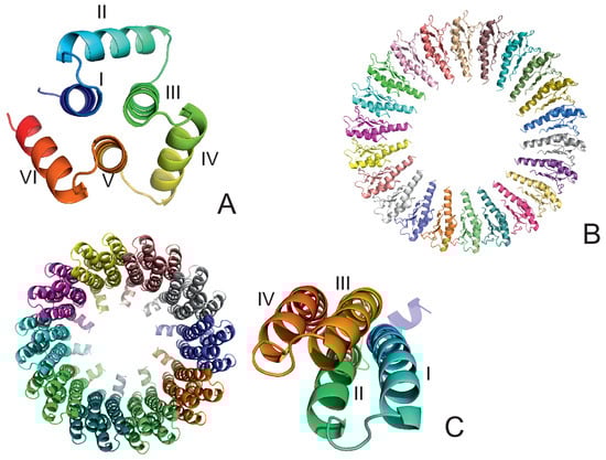 The experimental structures of the systems studied are shown in Figure 1A–C. The first system (PDB: 4YY2, 99 amino acid residues) is a designed 6--helix bundle with a toroid geometry. It has a triangular shape when viewed in the plane perpendicular to helices I, III, and V, which form an inner three-helix bundle, while helices II, IV, and VI are packed at an angle to helices I, III, and V. In its crystal structure, the outer helices are packed against those of the neighboring protein molecules. In our simulations, we considered only one monomer (chain A of the 4YY2 structure). The roughly triangular shape of a monomer makes it similar to a model triangle or to the cyclopropane molecule studied in an earlier work [15,16,17,18]. The protein is acyclic, so we imposed a weak N–C-terminus distance restraint in simulations to make it a ring (see Section 2.4). This system is hereafter referred to as 4YY2.