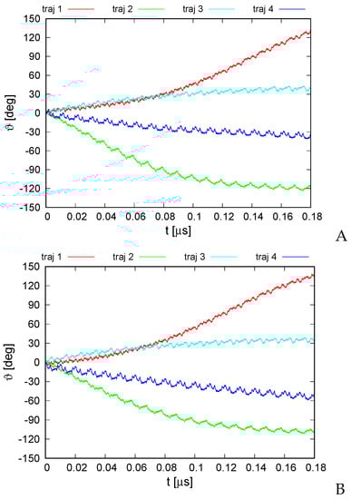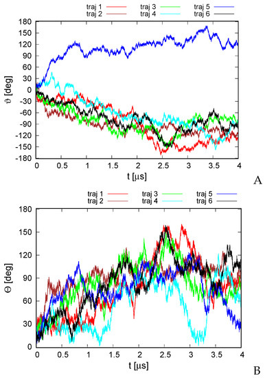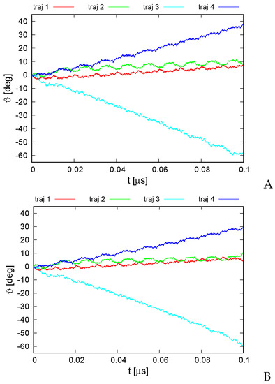 It can be seen from Figure 7 that all graphs of angle variation with simulations exhibit quite regular ratcheting patterns (with a period of about 0.01 s). These patterns seem to result from the fact that the random number generator was restarted with every run restart, which occurred after every 10,000,000 MD steps.