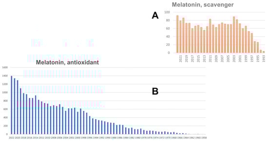 PubMed extraction of queries “melatonin + scavenger” (A); and “melatonin + antioxidant” (B).