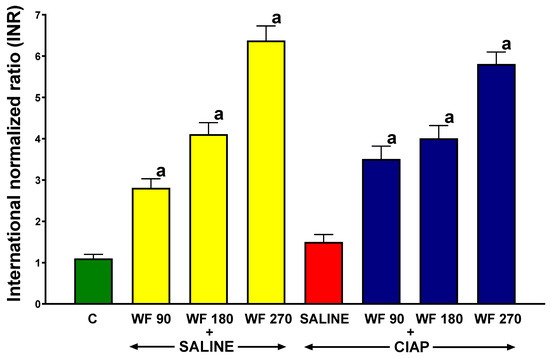 Effect of intragastric pretreatment with warfarin or saline on the prothrombin time measured as international normalized ratio (INR) in rats receiving intraperitoneal saline or rats with acute pancreatitis (cerulein-induced acute pancreatitis—CIAP). Key: C = saline-treated control; CIAP = cerulein-induced acute pancreatitis; WF = warfarin; 90 = 90 μg/kg/day; 180 = 180 μg/kg/day; 270 = 270 μg/kg/day. Mean ± SEM. N = 8 in each group of rats. a p < 0.05 compared to control.
