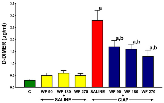 Effect of intragastric pretreatment with warfarin or saline on plasma D-Dimer concentration in rats receiving intraperitoneal saline or rats with acute pancreatitis (cerulein-induced acute pancreatitis—CIAP). Key: C = saline-treated control; CIAP = cerulein-induced acute pancreatitis; WF = warfarin; 90 = 90 μg/kg/day; 180 = 180 μg/kg/day; 270 = 270 μg/kg/day. Mean ± SEM. N = 8 in each group of rats. a p < 0.05 compared to control; b p < 0.05 compared to saline + CIAP.