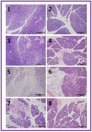 Representative morphological features of the pancreas observed in saline-treated control rats (1); rats pretreated with warfarin at a dose of 90 µg/kg/day without induction of acute pancreatitis (2); rats treated with warfarin at a dose of 180 µg/kg/day without induction of acute pancreatitis (3); rats treated with warfarin at a dose of 270 µg/kg/day without induction of acute pancreatitis (4); rats with cerulein-induced acute pancreatitis pretreated with saline (5); rats pretreated with warfarin at a dose of 90 µg/kg/day plus cerulein-induced acute pancreatitis (6); rats pretreated with warfarin at a dose of 180 µg/kg/day plus cerulein-induced acute pancreatitis (7); rats pretreated with warfarin at a dose of 270 µg/kg/day plus cerulein-induced acute pancreatitis (8). Hematoxylin–eosin stain, original magnification 200×.