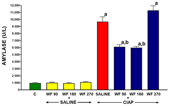 Effect of intragastric pretreatment with warfarin or saline on serum activity of amylase in rats receiving intraperitoneal saline or rats with acute pancreatitis (cerulein-induced acute pancreatitis—CIAP). Key: C = saline-treated control; CIAP = cerulein-induced acute pancreatitis; WF = warfarin; 90 = 90 μg/kg/day; 180 = 180 μg/kg/day; 270 = 270 μg/kg/day. Mean ± SEM. N = 8 in each group of rats. a p < 0.05 compared to control; b p < 0.05 compared to saline + CIAP.