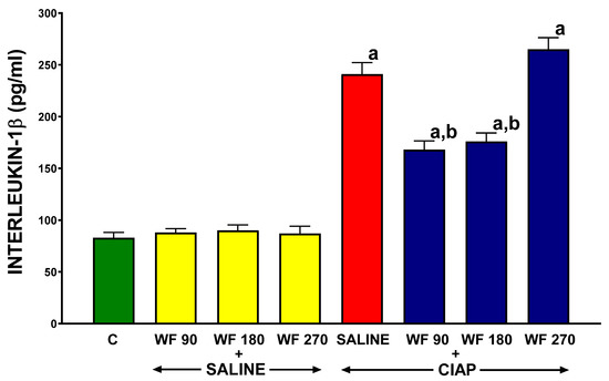 Effect of intragastric pretreatment with warfarin or saline on serum concentration of interleukin-1β in rats receiving intraperitoneal saline or rats with acute pancreatitis (cerulein-induced acute pancreatitis—CIAP). Key: C = saline-treated control; CIAP = cerulein-induced acute pancreatitis; WF = warfarin; 90 = 90 μg/kg/day; 180 = 180 μg/kg/day; 270 = 270 μg/kg/day. Mean ± SEM. N = 8 in each group of rats. a p < 0.05 compared to control; b p < 0.05 compared to saline + CIAP.