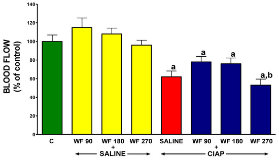 Effect of intragastric pretreatment with warfarin or saline on pancreatic blood flow in rats receiving intraperitoneal saline or rats with acute pancreatitis (cerulein-induced acute pancreatitis—CIAP). Key: C = saline-treated control; CIAP = cerulein-induced acute pancreatitis; WF = warfarin; 90 = 90 μg/kg/day; 180 = 180 μg/kg/day; 270 = 270 μg/kg/day. Mean ± SEM. N = 8 in each group of rats. a p < 0.05 compared to control; b p < 0.05 compared to WF 90 + CIAP.