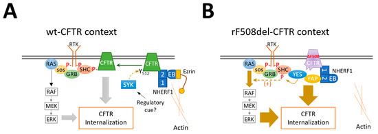 - Loureiro, C.A.; Pinto, F.R.; Barros, P.; Matos, P.; Jordan, P. A SYK/SHC1 Pathway Regulates the Amount of CFTR in the Plasma Membrane. Cell. Mol. Life Sci. 2020, 77, 4997–5015. [Google Scholar] [CrossRef]