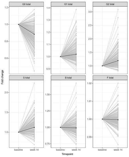The change in derived IgG N-glycan traits during 14 weeks of anti-TNF treatment (both IFX/ADA). Median glycan values for each time point are bolded. Y axis: relative change in glycan value normalised to baseline; X-axis: time point (baseline, week 14). Abbreviations: G0—agalactosylated glycans, G1—monogalactosylated glycans, G2—digalactosylated glycans, S—mono- and disialylated glycans, B—glycans with bisecting GlcNAc, F—core-fucosylated glycans.