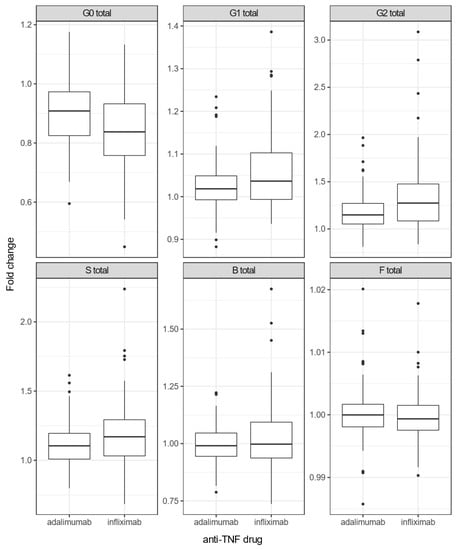 Change in derived IgG N-glycan traits in CD patients during the 14-week anti-TNF treatment with IFX or ADA. Each box represents the 25th to 75th percentiles (interquartile range-IQR). Lines inside boxes stand for the median. The whiskers are the lowest and highest values within boxes ± 1.5 × the IQR. Dots are outliers (>1.5 × IQR). Abbreviations: G0—agalactosylated glycans, G1—monogalactosylated glycans, G2—digalactosylated glycans, S—mono- and disialylated glycans, B—glycans with bisecting GlcNAc, F—core-fucosylated glycans.