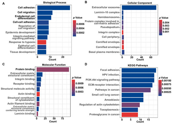 Functional enrichment analysis of exosome-related genes in HNSCC. Bar plot graph for GO and KEGG pathway enrichment. (A) Biological process. (B) Cellular component. (C) Molecular function. (D) KEGG pathways. Bar length represents gene count and color represents the p-value.