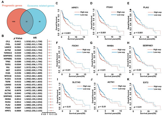 The prognostic value of exosome genes in HNSCC. (A) Venn diagram showing 25 prognostic exosome-related genes in HNSCC cohort. (B) Univariate Cox regression analysis of OS for each exosome-related gene with p < 0.05. Overall survival curves of top 9 prognostic exosome-related genes, (C) HPRT1, (D) ITGA5, (E) PLAU, (F) FSCN1, (G) INHBA, (H) SERPINE1, (I) SLC7A5, (J) ACTN1, and (K) EXT2, in HNSCC patients between the high-/low-expression groups.