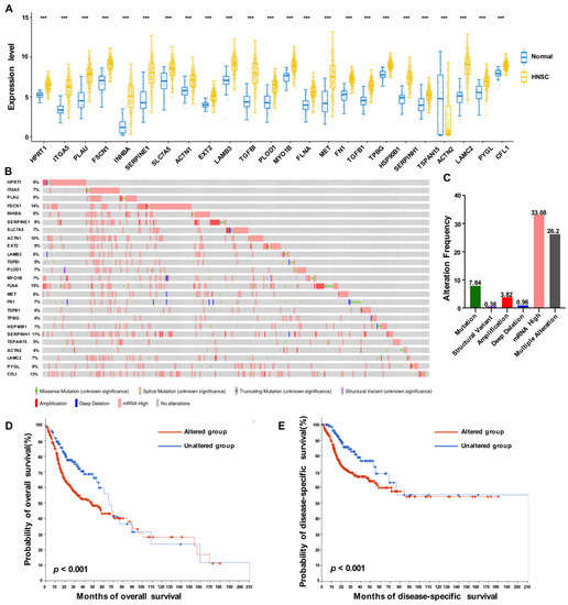 Expression profile of ERGs in HNSCC. (A) The mRNA expression levels of 25 prognostic ERGs in the TCGA-HNSCC cohort. (B,C) Gene alterations of 25 prognostic ERGs were analyzed via cBioPortal in HNSCC. (D,E) Kaplan–Meier plots comparing overall survival and disease-specific survival in cases with/without 25 ERGs alterations. *** p < 0.001.