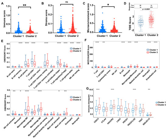 Association between ERG-high subtype and the immunosuppressive tumor microenvironment. (A–C) Immune score (A), stroma score (B), and microenvironment score (C) were calculated by ESTIMATE algorithm. (D) TIDE scores of clusters 1 and 2 were analyzed using the TIDE algorithm to predict tumor immunotherapy response rate. (E,F) CIBERSORT (E) and MCPCOUNTER (F) scores revealed differences in immune cell infiltration between clusters 1 and 2. (G) Differential expression levels of immune checkpoint-associated genes in clusters 1 and 2. * p < 0.05, ** p < 0.01, *** p < 0.001, ns: not significant.