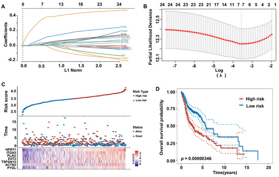 To further investigate the association between ERGs and prognosis in HNSCC, we employed the least absolute shrinkage and selection operator (LASSO) Cox regression algorithm to determine the minimum λ value (Figure 7A,B). Subsequently, we constructed a 7-gene signature based on the optimal λ value. The correlation between the expression levels of these 7 genes and the risk score is displayed in Figure 7C. The risk score was calculated as follows: Riskscore = (0.0944) × PYGL + (0.0237) × ACTN2 + (0.0133) × TSPAN15 + (0.0161) × EXT2 + (0.0368) × PLAU + (0.0092) × ITGA5 + (0.3567) × HPRT1. Based on the risk score, HNSCC patients were stratified into two groups, and Kaplan–Meier survival analysis indicated that patients in the high-risk group had a worse prognosis than those in the low-risk group (Figure 7D).