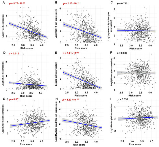 The correlation between the risk model and immune score in HNSCC via MCPCOUNTER algorithm. (A) T cells. (B) CD8+ T cells. (C) Cytotoxic lymphocytes. (D) NK cells. (E) B cells. (F) Monocytes/macrophages. (G) Endothelial cells. (H) Myeloid dendritic cells. (I) Neutrophils.