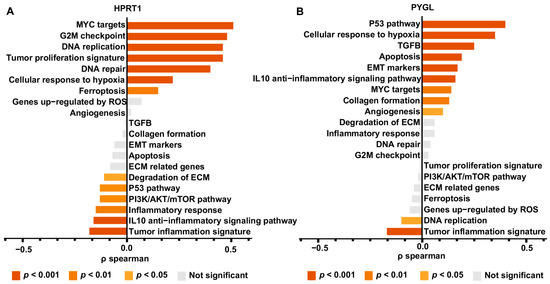 The present study explored the GEPIA database to investigate the expression levels and functions of HPRT1 and PYGL in multiple cancer types. HPRT1 expression was found to be upregulated in several cancer types, including BRCA, CESC, COAD, DLBC, ESCA, HNSC, LUAD, LUSC, PAAD, READ, SKCM, STAD, THYM, and UCEC, while it was downregulated in GBM, LAML, LGG, and TGCT (Figure S7A). Similarly, PYGL expression was upregulated in GBM, HNSC, KIRC, KIRP, LAML, LGG, PAAD, SKCM, and TGCT, but it was downregulated in ACC, DLBC, KICH, and THYM (Figure S7B). Furthermore, gene set enrichment analysis (GSEA) revealed that HPRT1 was positively associated with MYC targets, G2M checkpoint, tumor proliferation signature, DNA repair, cellular response to hypoxia, and ferroptosis, while it was negatively associated with ECM degradation, the P53 pathway, inflammatory response, and the IL10 anti-inflammatory signaling pathway (Figure 11B). In contrast, PYGL was positively correlated with the P53 pathway, cellular response to hypoxia, TGFβ, apoptosis, EMT marker, angiogenesis, collagen formation, and MYC targets, but it was negatively correlated with DNA replication and the tumor inflammation signature (Figure 11B). KEGG and GO functional enrichment analyses were also conducted, and the HPRT1 high expression group was associated with activation of the Wnt signaling pathway, drug metabolism, purine metabolism, ether lipid metabolism, skin development, epidermis development, and suppression of the IL17 signaling pathway compared to the HPRT1 low expression group (Figure S8). Similarly, the PYGL high expression group was highly associated with PI3K signaling, the Hippo pathway, human papillomavirus infection, extracellular matrix organization/assembly, and epidermis development. Overall, these findings suggested that HPRT1 and PYGL might play important roles in cancer development and prognosis (Figure S9).