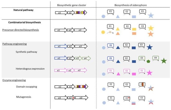 In addition to precursor-directed biosynthesis and heterologous expression of biosynthetic pathways, another strategy to generate siderophore diversity consists of modifying the enzymes involved in biosynthesis to alter their substrate specificity or activity. The core mechanism of NRPSs consists of the sequential addition of building blocks on the growing peptide chain. Thus, modifying these enzymes to change the selected substrate incorporated into the chain naturally occurred to researchers as a target for enzyme engineering, with the ambition of producing peptide diversity. The natural evolution of NRPSs and their products appears to have been the consequence of rearrangements and genomic alterations occurring spontaneously in nature, providing a strong indication that NRPS engineering is a good strategy to create siderophore analogs [99]. However, enzyme engineering has often resulted in low yields or truncated products and there has been little success [100,101], showing the need to develop other strategies to diversify the approach and provide several alternatives for enzyme engineering (Figure 1).
