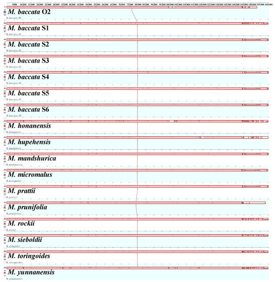 The homology of species can be better understood by global genome comparison. With O2 as the reference genome, the six chloroplast genomes sequenced in this study showed high homology, which was not only reflected in the reverse repetition region but also in other regions. As shown in Figure 1, a large number of similar fragments are scattered throughout the chloroplast genome. At the same time, a comparison of 7 M. baccata and 10 other species of Malus showed that chloroplast genomes had good collinearity and no structural rearrangement events were detected (Figure 1). Furthermore, the same phenomenon was found by comparing the chloroplast genomes of different species of Malus (Figure S2). What is different is that the interspecific similarity is different in different species. For example, when both are compared with M. baccata S1, the similarity effect of M. toringoides is better than that of M. kansuensis.