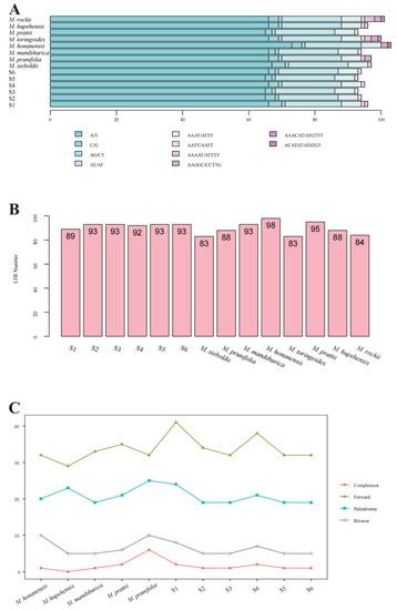 The repeats in the chloroplast genome mainly include the following categories: SSRs (simple sequence repeats), LTRs (long tandem repeats) and LSRs (large sequence repeats, dispersed repeats). A large number of repeating elements were identified in the chloroplast genomes of six M. baccata species (Table 2) and other different species of Malus based on their identifying characteristics. In these cp genomes, M. honanensis has the largest number of SSRs (103), followed by M. rockii (101), M. toringoides (100) and so on (Figure 2A). The number of SSRs from M. baccata S1 to S6 was between 93 (M. baccata species S3 and S5) and 96 (M. baccata species S1). The ‘ACATAT/ATATGT’ SSR type was only identified in the M. honanensis cp genome. M. prunifolia, M. honanensis, M. toringoides and M. rockii had two ‘AAGGC/CCTTG’ components. Among the 14 cp genomes, the number of LTRs was concentrated between 83 (M. sieboldii, M. toringoides) and 98 (M. honanensis) (Figure 2B). Of the six M. baccata species, S2, S3, S5 and S6 had 93 LTR repeats, followed by S4 (92) and S1 (89). LSR type of repeat was a repetitive sequence scattered throughout the chloroplast genome and was involved in the stability and size of the chloroplast genome. LSRs were made up of four types: C (Complement), F (Forward), P (Palindromic) and R (Reverse). F was the most abundant LSR element, followed by P and R. The largest cumulative total for the four LSR components (C, F, P and R) was in M. baccata S1, which had 75. In addition, M. baccata species S3, S5 and S6 and M. hupehensis had the same number of LSRs, which was 57 (Figure 2C).
