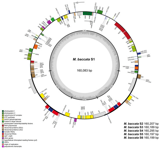 Structure and composition of the cp genome of M. baccata. The inner ring represents the four constituent regions of the chloroplast, and the different types of genes are arranged in order in the outer ring. Gray arrows represent transcription directions.