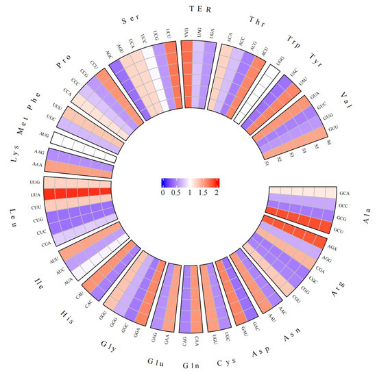 RSCU analysis of cp CDS in M. baccata. The outer ring indicates the different codon types, and the scale in the inner ring represents the RSCU value size.