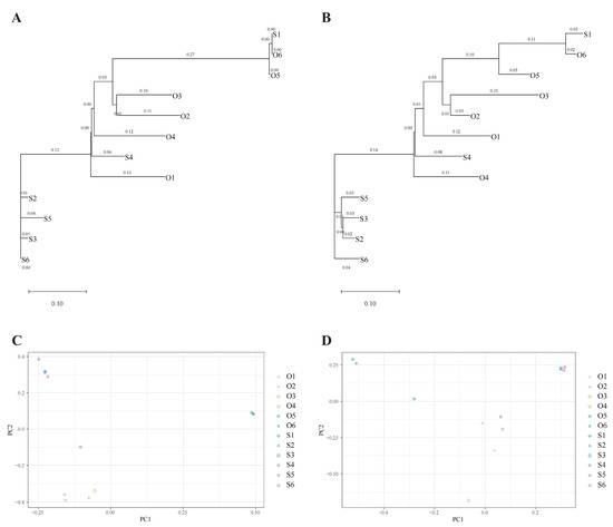 Based on the reference genome (MK896774), 12 chloroplast genomes of M. baccata were tested for variation to explore their relationship composition and lineage structure. A total of 78 SNPs and 109 INDELs were found and extracted for building the evolutionary trees and principal components. As can be seen from Figure 8A, the evolutionary tree based on SNPs is mainly divided into three main branches. The first branch includes S1, O6 and O5, the second branch includes O3, O2, O4, S4 and O1 and the third branch includes S2, S5, S3 and S6. This result is also well reflected in the PCA analysis (Figure 8C). The tree topology structure (Figure 8B) and principal component analysis (Figure 8D) based on INDELs, in general, also shows a consistent and similar phenomenon to the results from the SNP analysis; however, under this clustering condition, the relationship between S1 and O6 was closer than that between S1 and O5 (Figure 8B,D).