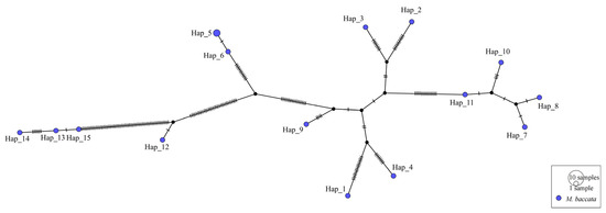 The dominant and shared haplotypes were obtained by haplotype analysis in order to understand the species gene exchange and evolution process. By comparing the different individuals of M. baccata and M. baccata var. xiaojinensis, it was found that they formed 15 haplotypes and that haplotype 5 was composed of two individuals (M. baccata O5 and O6). It can be clearly seen from Figure 9 that the four haplotypes (Hap11, 10, 8 and 7) were closely diffused and evolved and that variants Hap_12, 13, 14 and 15 (M. baccata var. xiaojinensis) were obviously far away from the M. baccata on the right (Figure 9), which is in accordance with their morphological and evolutionary characteristics.