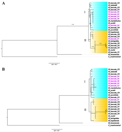 Phylogenetic relationships and species classification of M. baccata and Malus based on chloroplast genome sequences (126,832 loci). The scale of the phylogenetic tree reflects the evolutionary distance. The genomes and sequences produced in this study are distinguished in purple. I and II represent two branches containing M. baccata individuals, highlighted in blue and orange respectively. (A) Maximum likelihood tree—the number on the branch indicates the bootstrap support; (B) Bayesian inference tree—the number at the node represents the posterior probability.