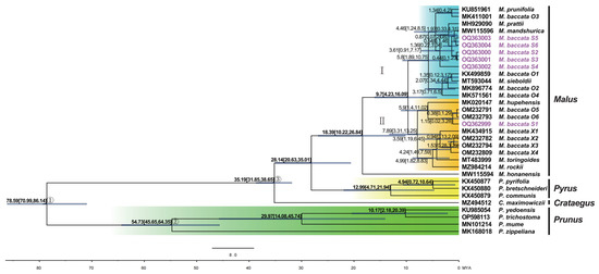 Divergent time tree of M. baccata and other species based on shared coding sequences in cp genomes (58,056 loci). The six M. baccata individuals in this study are shown in purple. The two evolutionary branches of the Malus genus that contain the M. baccata (I and II) and the speciation branches of the Pyrus and Prunus genera are highlighted in blue, orange, yellow and green, respectively. The fossil points and calibration dates are plotted with circled numbers. The scale shows millions of years ago. The numbers and intervals on the nodes represent the divergence time and the 95% highest posterior density (also drawn in blue node bars).