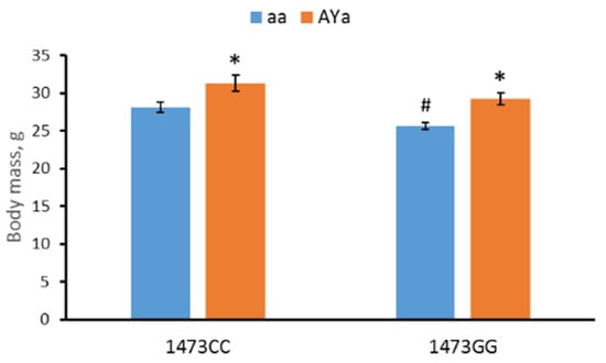 Body masses (g) of 12-week-old males of B6-1473CC/aa, B6-1473CC/AYa, B6-1473GG/aa and B6-1473GG/AYa mice. * p < 0.05 vs. corresponding aa genotype. # p < 0.05 vs. B6-1473CC/aa mice.