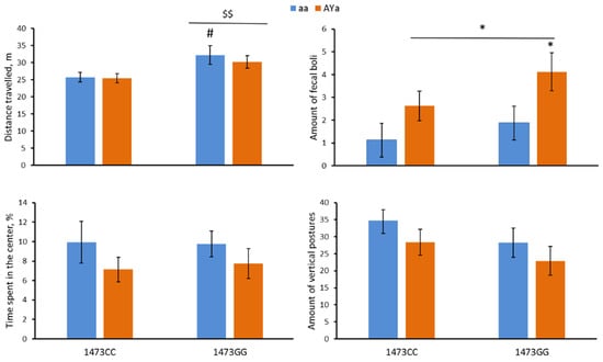 Distance travelled (m), amount of fecal boli, time spent in the center (%) and number of vertical postures in the open field test in 12-week-old male B6-1473CC/aa, B6-1473CC/AYa, B6-1473GG/aa and B6-1473GG/AYa mice. * p < 0.05 vs. corresponding aa genotype; $$ p < 0.01 vs. the 1473CC mice; # p < 0.05 vs. the B6-1473CC/aa mice.