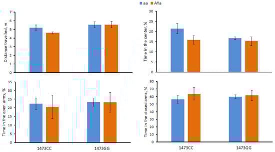 The lethal yellow (AY) mutation is a large deletion in the Raly-Agouti locus that deletes the Raly gene-coding domain and puts the Agouti gene under the control of the Raly gene promoter [,]. It results in an ectopic expression of the agouti protein in the brain [,,]. The agouti protein is a natural inhibitor of the MC3R and MC4R melanocortin receptors [,]. It is hypothesized that blockade of these receptors in the hypothalamus by the agouti protein causes obesity in heterozygous AY/a mice [,]. Moreover, the AY allele increased depressive-like immobility in the forced swim and tail suspension tests []. It can be expected that the combination of the C1473G and AY alleles will increase the severity of the behavioral disorders caused by each of these mutations separately.