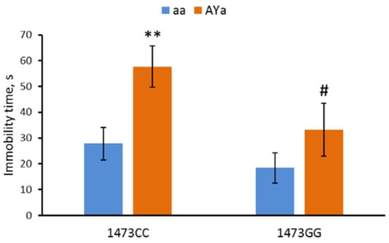 Immobility time in the forced swim test in 12-week-old male B6-1473CC/aa, B6-1473CC/AYa, B6-1473GG/aa and B6-1473GG/AYa mice. ** p < 0.01 vs. corresponding aa genotype; # p < 0.05 vs. the B6-1473CC/AYa mice.