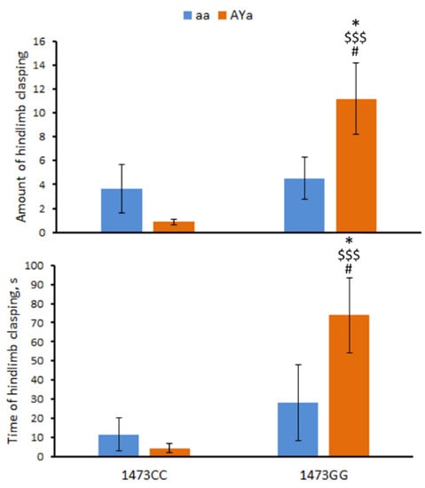 Amount of hind limb clasping and time spent hindlimb clasping in the tail suspension test in 12-week-old male B6-1473CC/aa, B6-1473CC/AYa, B6-1473GG/aa and B6-1473GG/AYa mice. * p < 0.05 vs. B6-1473CC/aa mice; $$$ p < 0.001 vs. B6-1473CC/AYa mice; # p < 0.05 vs. the B6-1473GG/aa mice.